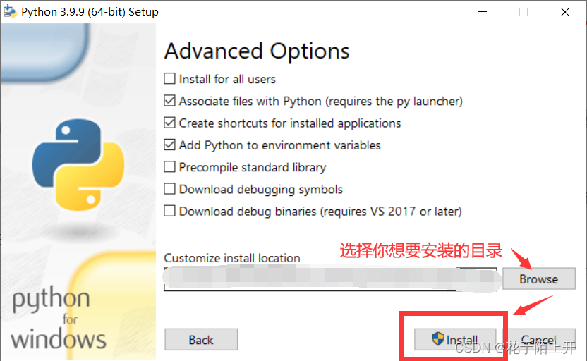 自选路径安装 如果你的Windows电脑有多个磁盘,又不想将Python3安装在默认路径下,可以选择下方的 [Customize installation] 进行安装,点击:[Next]->选择安装路径->点击[Install] 请务必记好本步将Python安装的路径,之后会用上的!