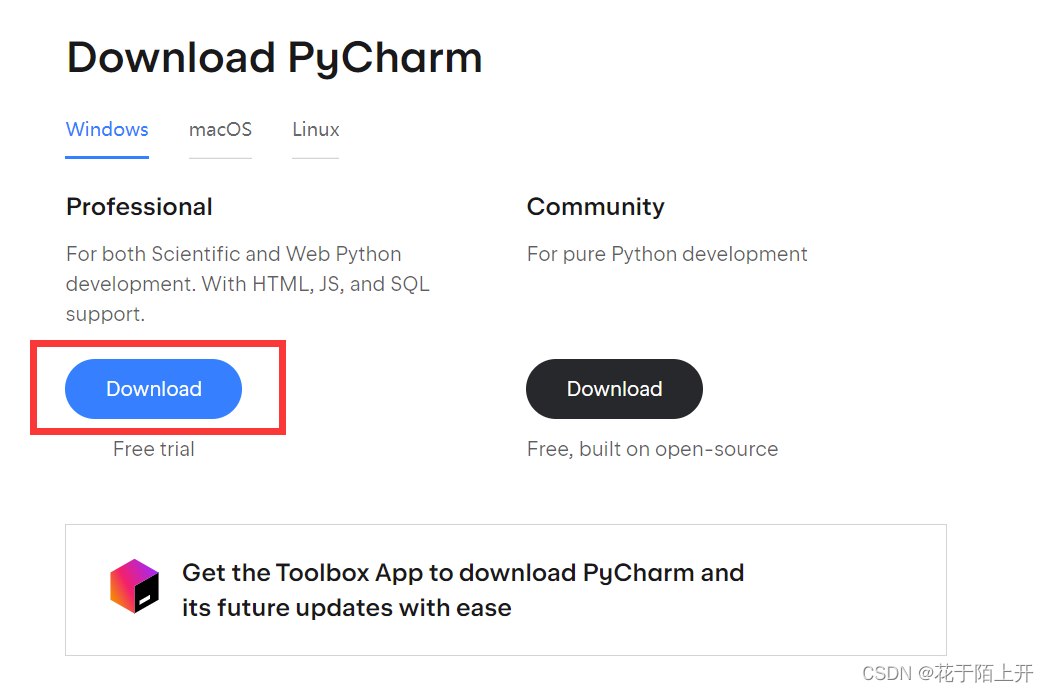 - 进入到PyCharm官网(网站链接:PyCharm官网),下滑找到Download PyCharm,在这里我选择Professional版本作为演示(很多入门都是学生,可以申请学生免费许可证,具体方法见官方页面),不是学生可以下载Community或者免费试用30天...