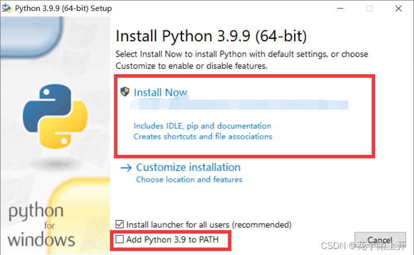 下载好之后打开开始安装,请注意:务必勾选下方的 [Add Python 3.9 to PATH] 前方的复选框。 如果发现没有勾选怎么办呢,也不要着急卸载,等下会给出解决方案...