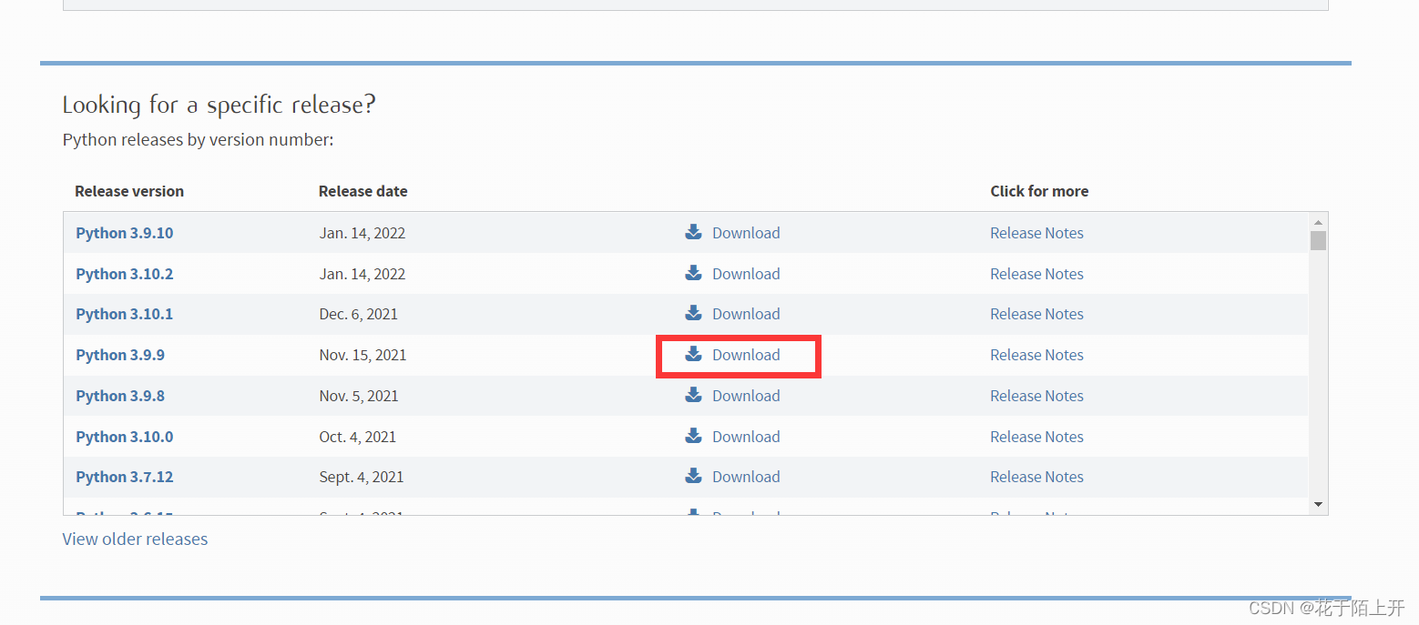 - 进入到Python官网(网站链接:Python官网),下滑找到Python 3.9.9 点击 【Download】 进入到页面