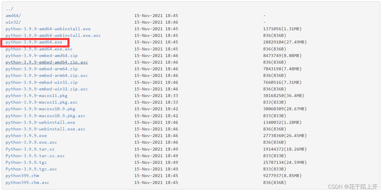 - 等待下载完成(国外网站访问与下载都会比较慢,可以通过国内镜像网站访问下载) 阿里云镜像:网页链接:阿里云镜像-Python3.9.9