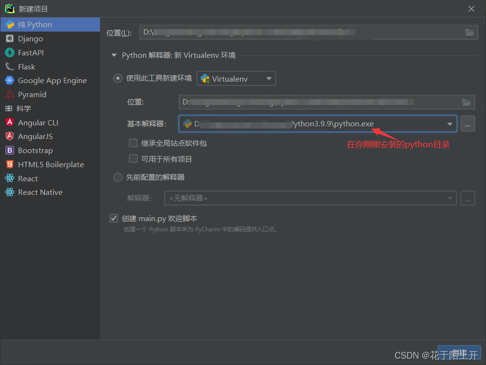 新建一个项目->配置解释器->在你刚刚安装python的目录中找到python.exe,选择作为基本解释器。点击[创建]